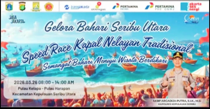 Kepualauan Seribu, www.jayaposnews.co.id — Lomba adu cepat kapal nelayan tradisional akan menjadi salah satu daya tarik utama dalam gelaran “Gelora Bahari Seribu Utara 2026” yang akan berlangsung pada Kamis, 26 Maret 2026. Perlombaan tersebut akan dimulai pukul 08.00 WIB dari garis start di Pulau Kelapa dan berakhir di Pulau Harapan.